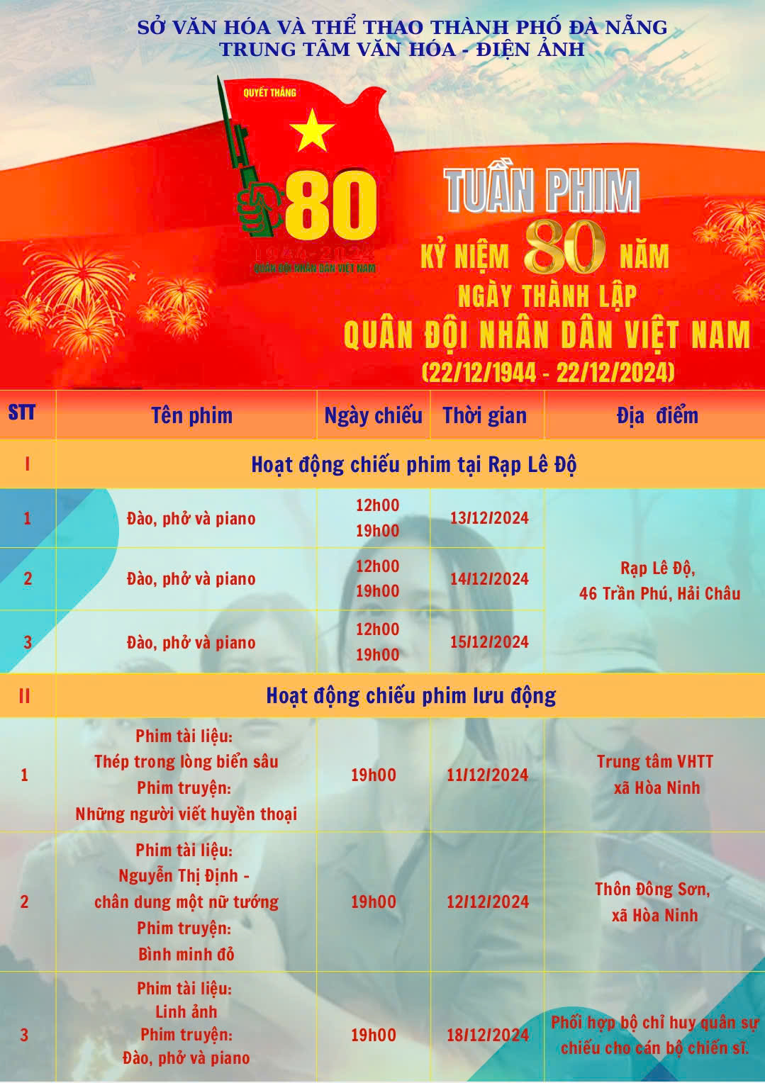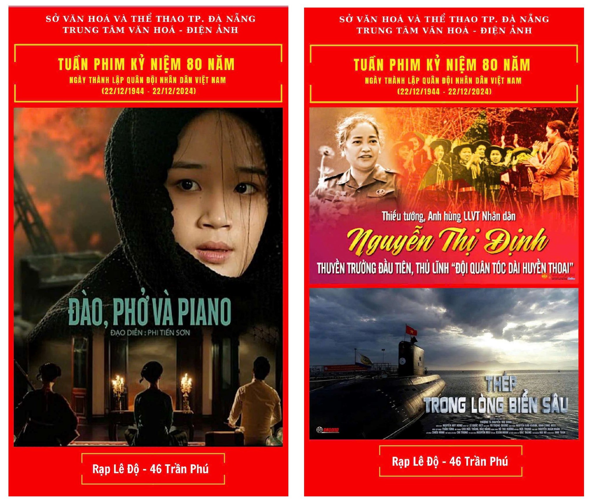 Trung tâm Văn hóa – Điện ảnh thành phố Đà Nẵng tổ chức Tuần phim nhân dịp kỷ niệm 80 năm Ngày thành lập Quân đội nhân dân Việt Nam (22/12/1944 – 22/12/2024). Đây là sự kiện tri ân, tôn vinh lịch sử vẻ vang, truyền thống trung với Đảng, hiếu với dân, vì nhân dân quên mình của Quân đội nhân dân Việt Nam; đồng thời tuyên truyền thế hệ đi sau về truyền thống yêu nước, phát huy chủ nghĩa anh hùng cách mạng, khơi dậy lòng tự hào dân tộc.