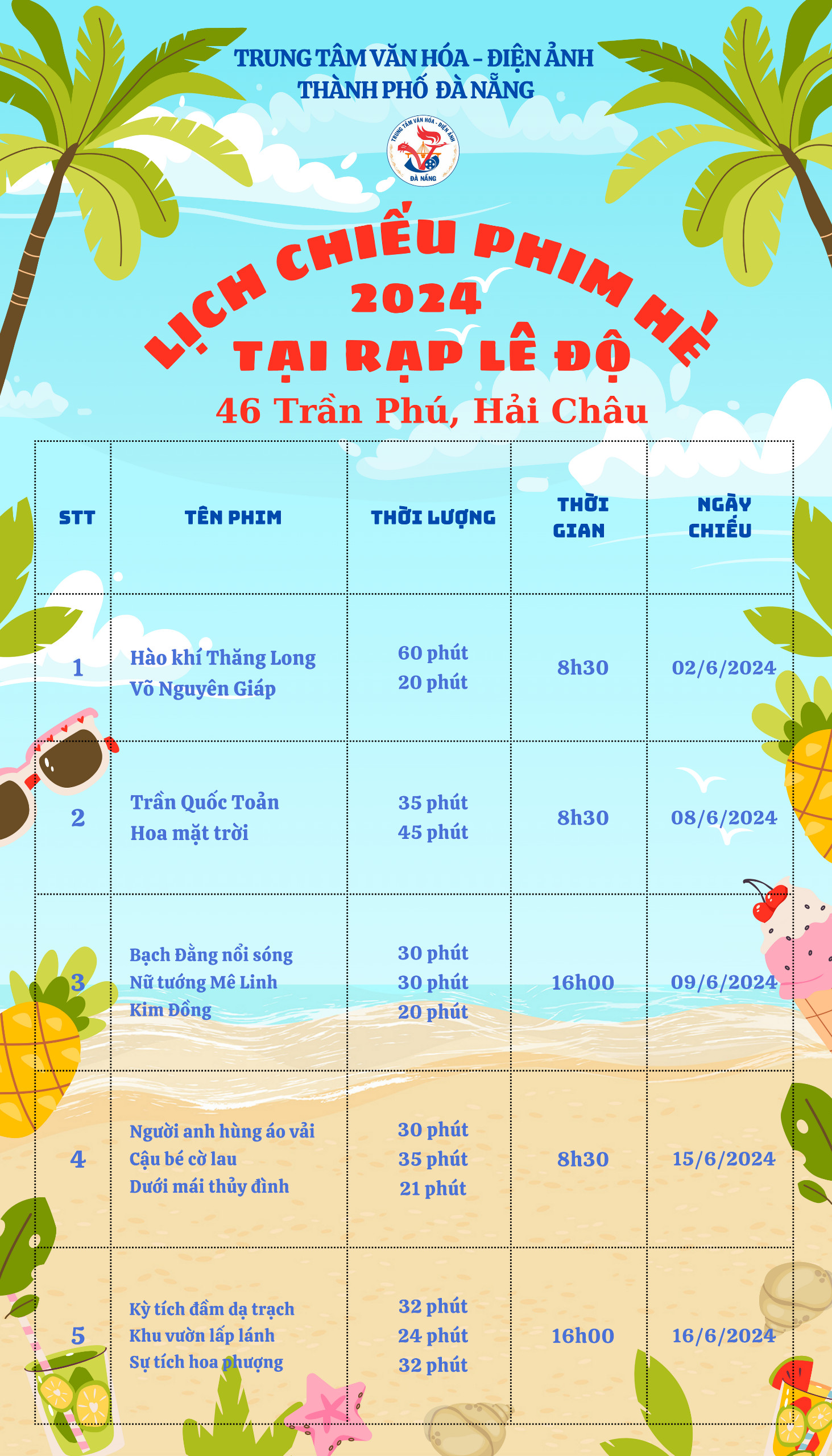 Vào lúc 8h30 ngày 02/6/2024, tại Rạp Lê Độ thuộc Trung tâm Văn hóa – Điện ảnh TP Đà Nẵng sẽ tổ chức buổi chiếu phim hè đầu tiên để phục vụ các em thiếu nhi, đây là hoạt động nằm trong kế hoạch hàng năm của đơn vị.