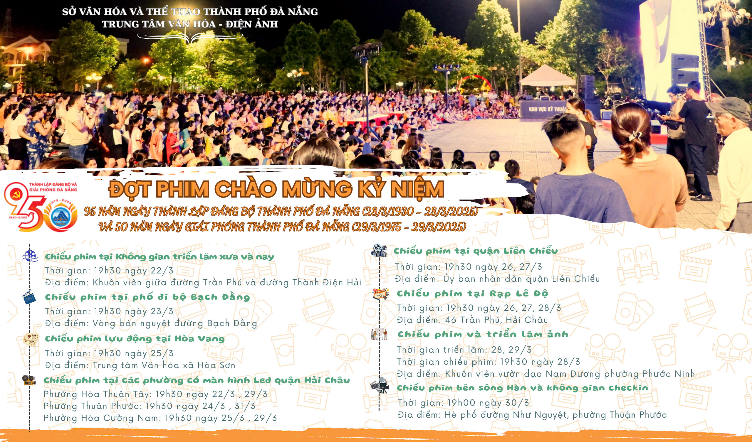 Kỷ niệm 95 năm Ngày thành lập Đảng bộ thành phố Đà Nẵng (28/3/1930 – 28/3/2025) và 50 năm Ngày Giải phóng thành phố Đà Nẵng (29/3/1975 – 29/3/2025), Trung tâm Văn hóa – Điện ảnh thành phố Đà Nẵng tổ chức nhiều hoạt động văn hóa và nghệ thuật đặc sắc, trong đó có các chương trình chiếu phim nhằm tái hiện lại những trang lịch sử hào hùng, góp phần giáo dục truyền thống và đạo lý “uống nước nhớ nguồn”, tưởng nhớ đến các anh hùng liệt sĩ đã hi sinh vì sự nghiệp giải phóng thành phố và đất nước. Đồng thời sự kiện giúp các thế hệ trẻ hiểu rõ hơn về lịch sử hào hùng của dân tộc, khơi dây lòng yêu nước và tinh thần tự hào dân tộc. Đợt phim sẽ giới thiệu đến quý khán giả những bộ phim tài liệu và phim truyện, trong đó có các phim mà đạo diễn, nhân vật trong phim là người con của vùng đất Quảng Nam – Đà Nẵng anh hùng.