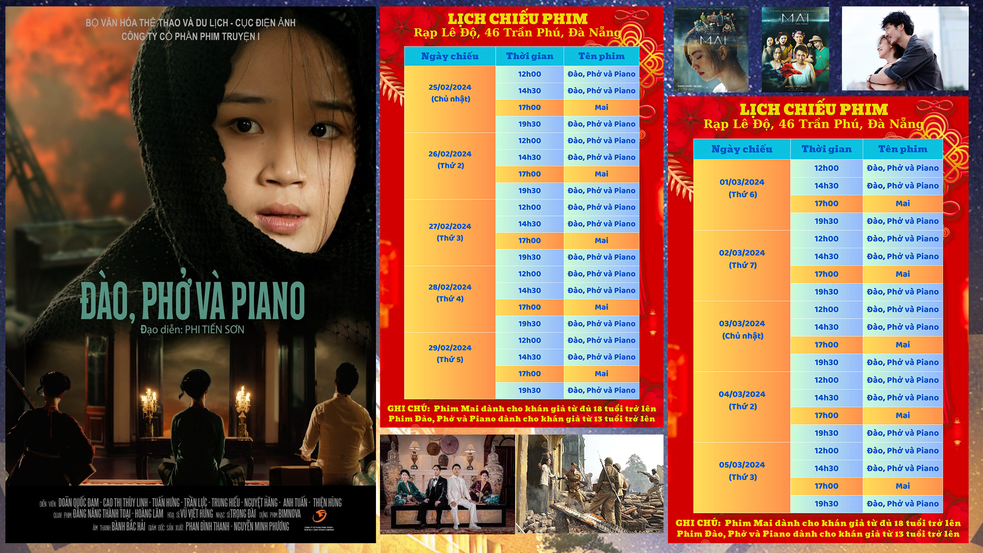 Lịch chiếu “Đào, phở và piano” sẽ được công khai trên fanpage Rạp Chiếu phim Lê Độ Đà Nẵng, và mở bán vé trực tiếp tại quầy từ ngày 24/02/2024 vào khung giờ 9h00 đến 21h00 hàng ngày, địa chỉ Rạp Lê Độ, số 46 Trần Phú, TP. Đà Nẵng./.