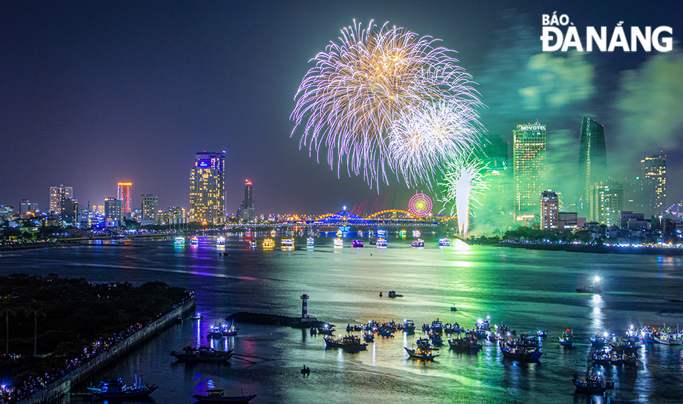 Thành phố nhìn cửa sông Hàn từ xa như khoác một màu áo mới bằng màn biểu diễn của hai đội. Ảnh: Phạm Toàn