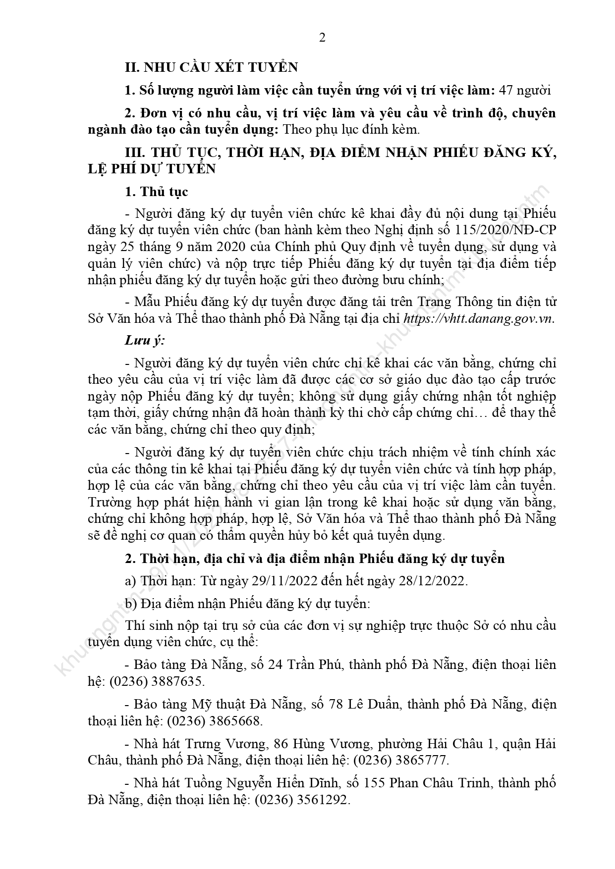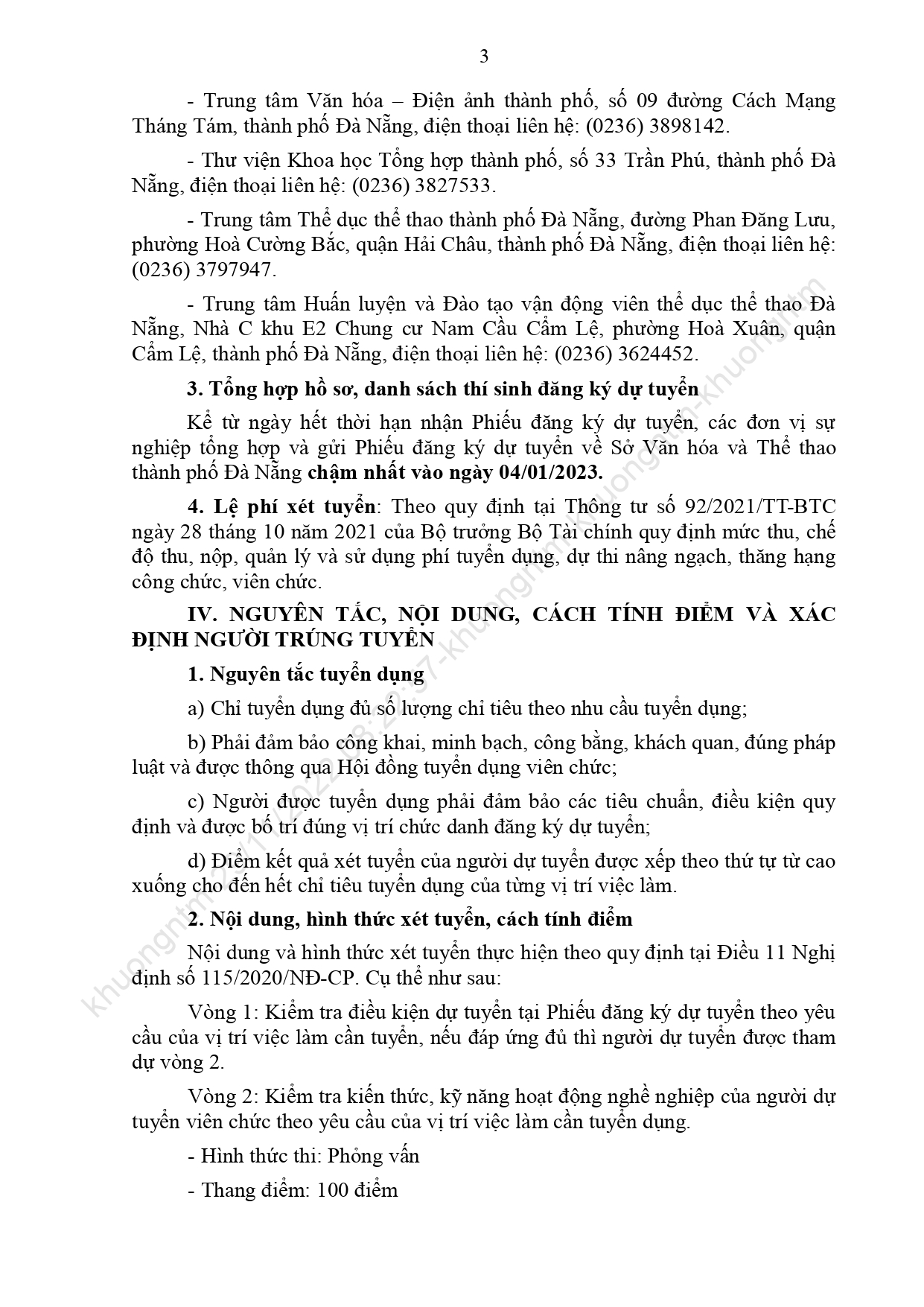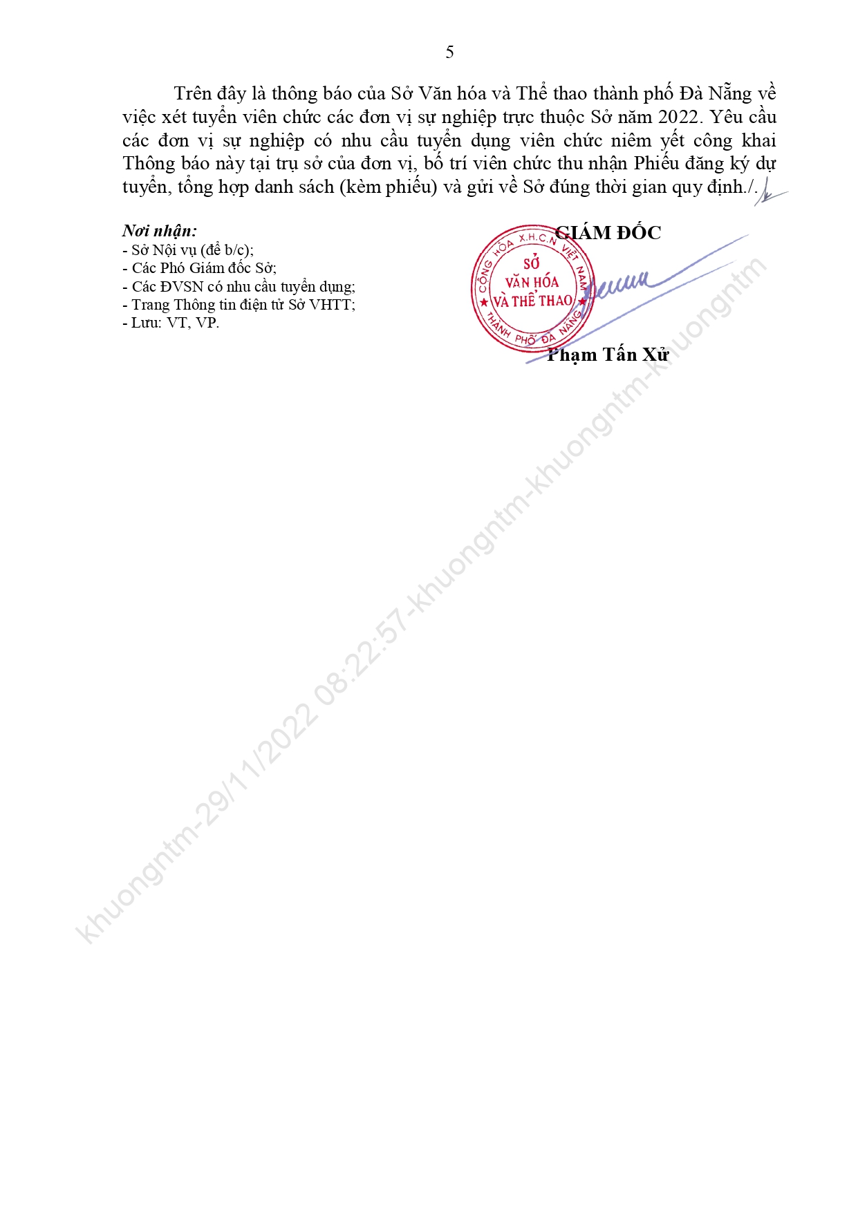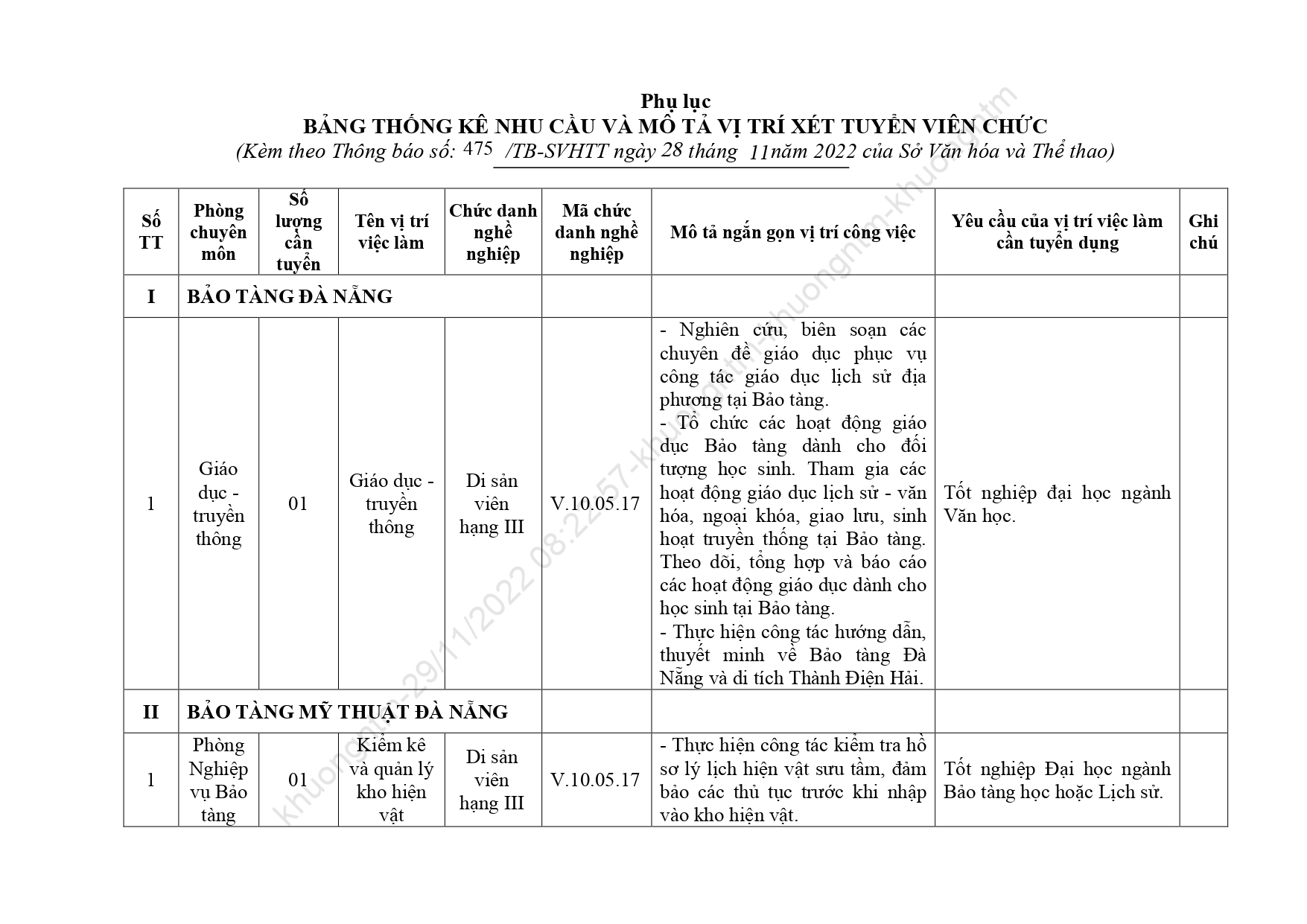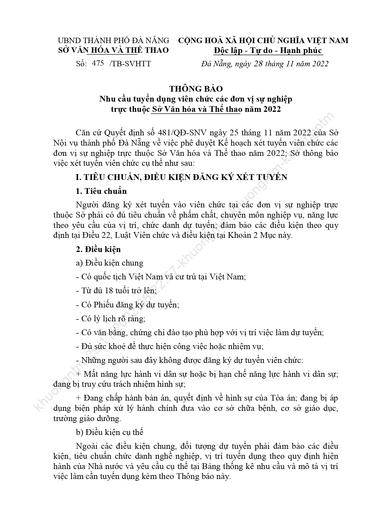Căn cứ Quyết định số 481/QĐ-SNV ngày 25 tháng 11 năm 2022 của Sở Nội vụ thành phố Đà Nẵng về việc phê duyệt Kế hoạch xét tuyển viên chức các đơn vị sự nghiệp trực thuộc Sở Văn hóa và Thể thao năm 2022. Sở thông báo việc xét tuyển viên chức cụ thể như sau: