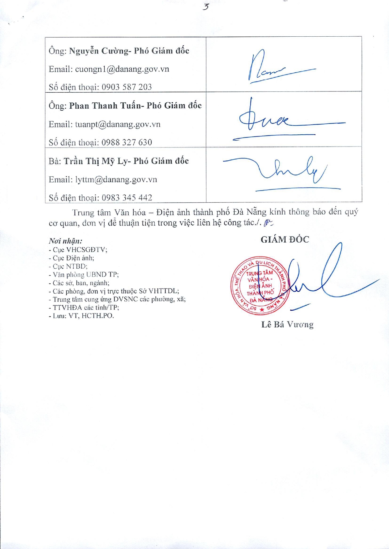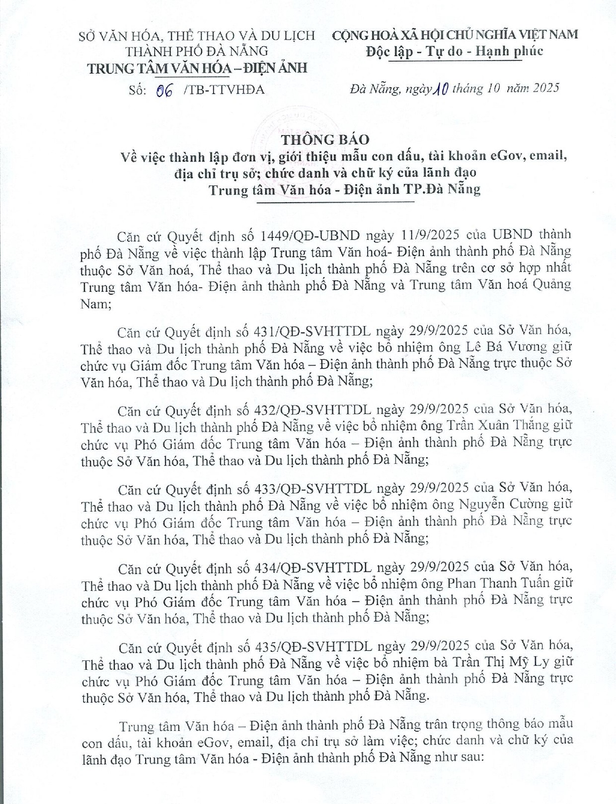 Thông báo về việc thành lập đơn vị, giới thiệu mẫu con dấu, tài khoản eGov, email, địa chỉ trụ sở; chức danh và chữ ký của lãnh đạo Trung tâm Văn hóa – Điện ảnh TP.Đà Nẵng