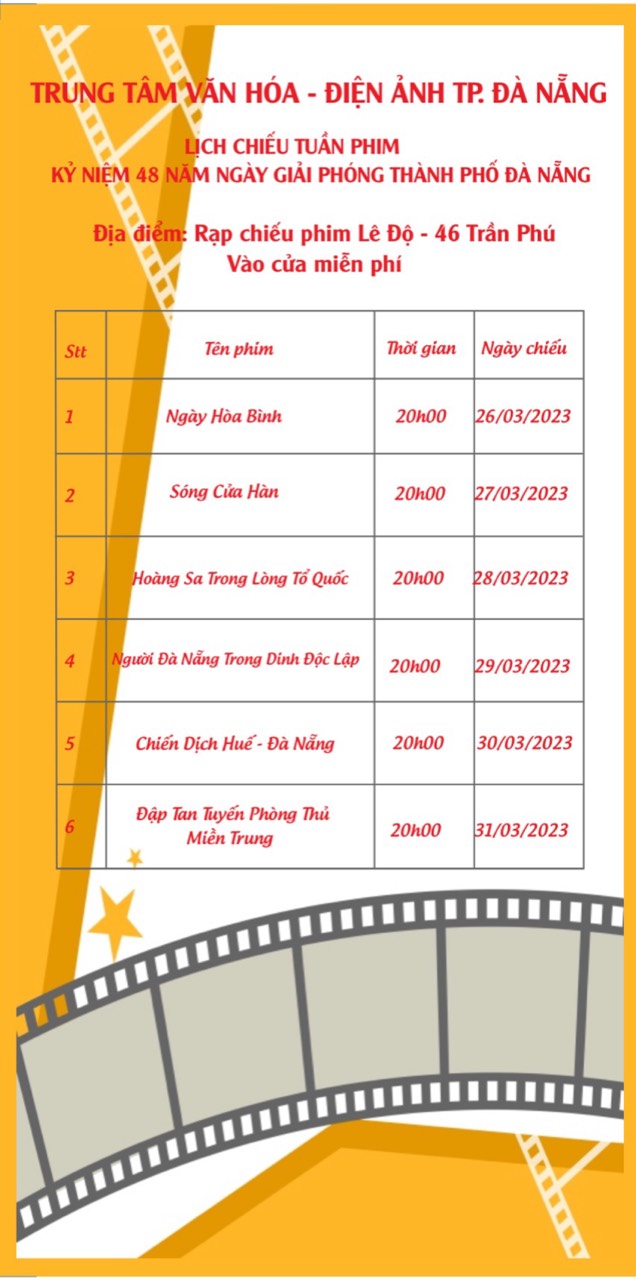 Tháng 3 là tháng có nhiều sự kiện, ngày lễ quan trọng, đặc biệt là đối với thành phố Đà Nẵng. Trung tâm Văn hóa – Điện ảnh tiếp tục triển khai Tuần phim để kỷ niệm 48 năm ngày giải phóng thành phố Đà Nẵng (29.3.1975 – 29.3.2023)