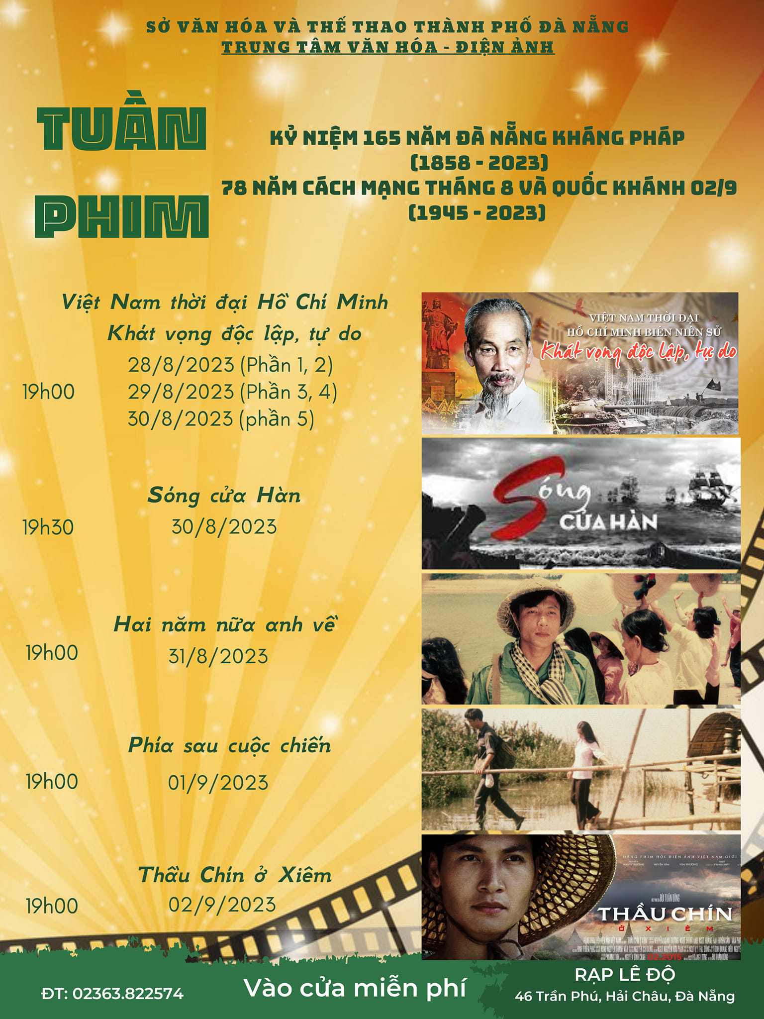 Nhân dịp kỷ niệm 165 năm Đà Nẵng kháng Pháp (1858 – 2023); 78 năm ngày Cách mạng tháng 8 và Quốc Khánh 02/9, Trung tâm Văn hóa – Điện ảnh thành phố Đà Nẵng tổ chức Tuần phim kỷ niệm mang ý nghĩa ôn lại lịch sử buổi đầu kháng Pháp của dân tộc Việt Nam nói chung và thành phố Đà Nẵng nói riêng. Khẳng định vị trí, tầm vóc vĩ đại và giá trị lịch sử to lớn của Cách mạng tháng 8 và Quốc khánh 02/9.